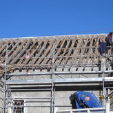Mêmes opérations sur la toiture Sud de la nef que pour la face Nord. Vérification charpente et pose de la couverture